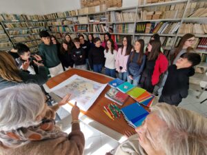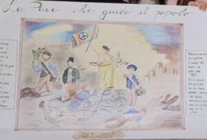 I giovani studenti emozionati hanno illustrato il disegno che a permesso loro di vincere materiale didattico e l’accesso allo step successivo del concorso internazionale: il poster si ispira al dipinto ” La Libertà che guida il popolo” di Eugène Delacroix esposto al Museo del Louvre a Parigi. Al centro una donna (La libertà) con la bandiera arcobaleno da un parte e un ramo d’ulivo dall’altra. I ragazzi hanno voluto sottolineare come si devono abbandonare le armi e stringere i simboli della pace: per tutti il primo pensiero è andato al conflitto israelo-palestinese e alla guerra tra Russia e Ucraina.