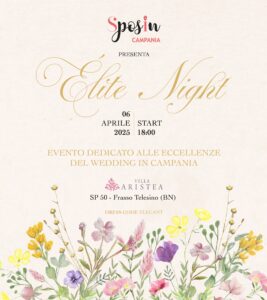 Élite Night si terrà domenica 6 aprile 2025 presso la suggestiva Villa Aristea a Frasso Telesino (BN), dove si ritroveranno le migliori aziende e professionisti del settore per una serata di festa in occasione della sesta edizione di The Best of SposInCampania.