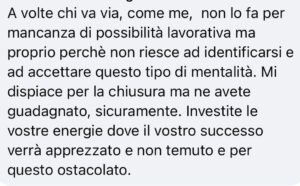 Una riflessione amara, ma lucida: “Noi ci abbiamo provato fino in fondo, credendo nel territorio. Altri, forse con più pragmatismo, se ne vanno senza neppure provarci. E forse, a questo punto, hanno ragione loro”.