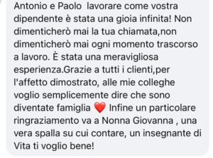 In chiusura, i titolari rivolgono parole di sincera gratitudine: “A chi vuole continuare a credere nel territorio va il nostro augurio più sincero. Ai clienti, agli amici, ai cittadini che ci hanno dato fiducia e calore, va il nostro eterno grazie. Un ringraziamento speciale va ai nostri collaboratori che ci hanno accompagnato in questa avventura, sempre con il sorriso e con grande disponibilità verso i clienti”.
